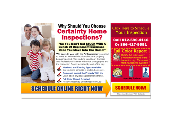Many times pre-purchase home inspections need to be scheduled at moment's notice. Scott is willing to anywhere in Kentucky or Indiana. Call or text and an appointment can be made all most immediately. Services are also competitively priced, with a base rate of $250 per inspection. Discounts are also given to first time home buyers and if a second inspection is necessary.
